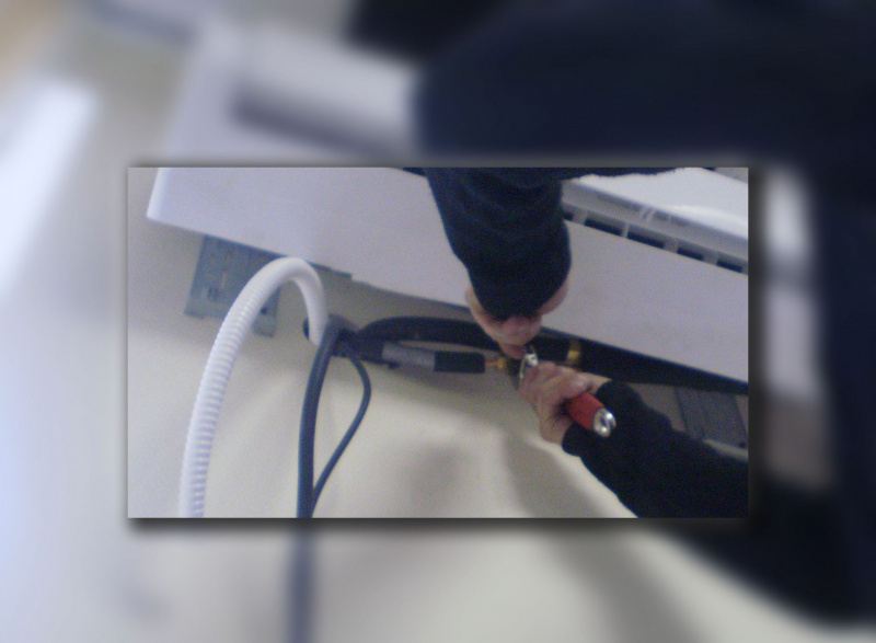 8. Соединение внутреннего и наружного блоков системы путем подключения фреоновой труботрассы, сигнального кабеля, кабеля электропитания и дренажного гофрированного шланга.