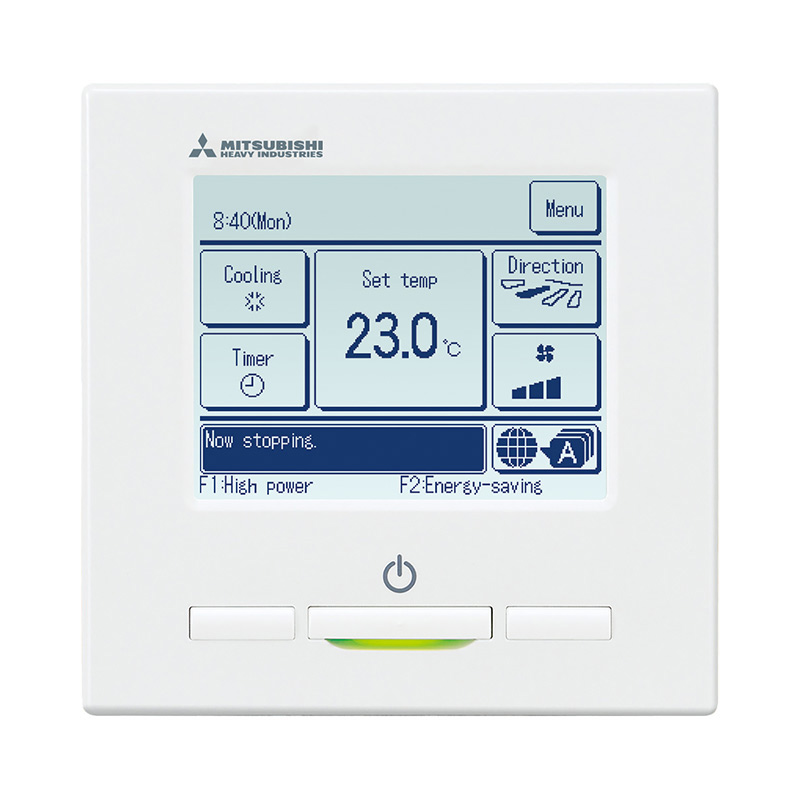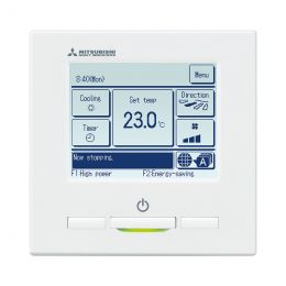На передней части корпуса этого пульта расположена широкая (3,8 дюйма) сенсорная панель с подсветкой и многоязычным интерфейсом, при помощи которой осуществляется управление работой внутреннего блока. В нижней части блока имеется три кнопки, при помощи которой пользователь может одним нажатием включить режим повышенной производительности, режим энергосбережения, а также включить и выключить оборудование.